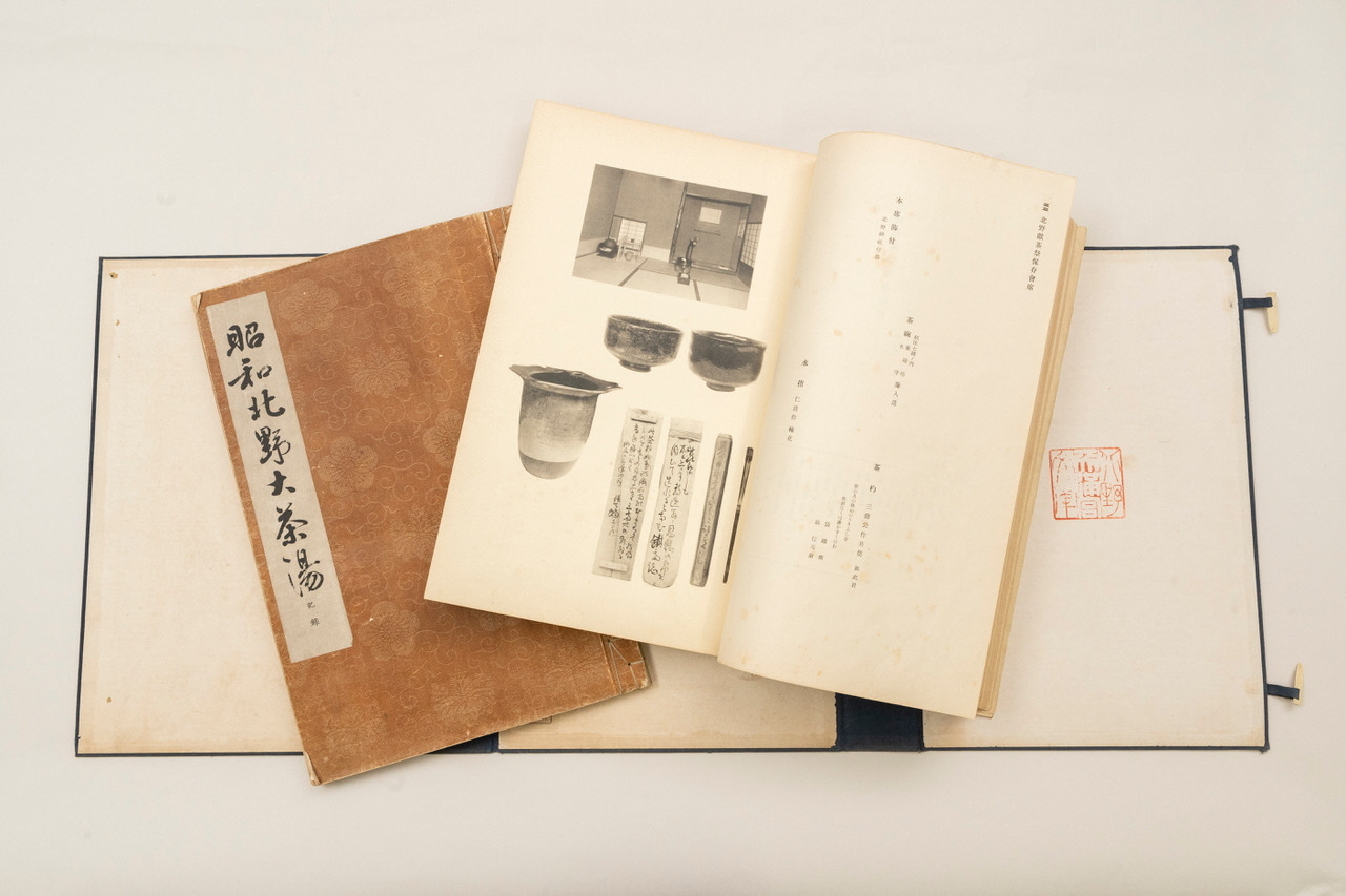 前出の“北野大茶湯図”や『北野大茶湯之記』などが残っており、この度の催し期間中も宝物殿にて展示予定です。また350周年を記念し1936年に催された昭和北野大茶湯の資料も保管されています。こちらは参加者や、当日の配置などを事細かに記録した資料です。